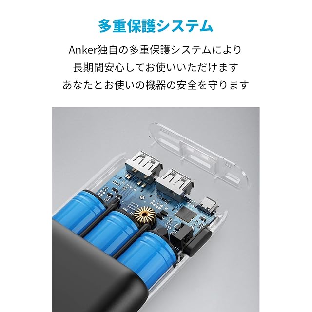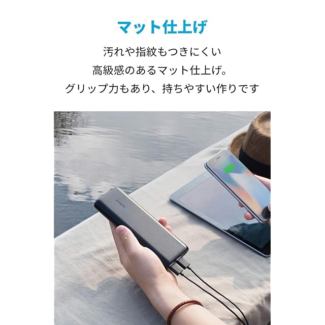 Anker PowerCore 20100<br>PowerIQ搭載の超大容量モバイルバッテリー<br><br>主な製品仕様<br>寸法:約166 x 58 x 22mm<br>重量:約356g<br>入力:5V/2A、出力:5V / 4.8A<br><br>超大容量 <br>20100mAhの大容量で、iPhone 11 Proに約4回以上、Galaxy S9に約5回、iPad Pro (2018, 11インチ)に約2回の充電が可能です。<br><br> フルスピード充電技術 <br> Anker独自技術PowerIQ(接続機器を検知し電流を最適化)とVoltageBoost(ケーブル抵抗を検知し出力電圧を自動調整)により、フルスピード充電を実現しました。 <br><br> 業界トップクラスの4.8A出力 <br> 業界トップクラスの4.8A出力で、タブレット2台も同時にフルスピード充電が可能です。 <br><br> よりコンパクトに <br> 従来の20000mAhモバイルバッテリーから、サイズ重量ともに約30%の小型化・軽量化を実現。20000mAh以上のモバイルバッテリーでは、最もコンパクトです。 <br><br> マット仕上げ <br> 汚れや指紋もつきにくい高級感のあるマット仕上げ。グリップ力もあり、持ちやすい作りです。 <br><br> 世界でも名高い製品 <br> Ankerは弊社製品に絶対の自信を持っています。そのため、18ヶ月と品質の高いカスタマーサポートを全ての製品に提供しています。<br><br> 最適なご使用のために <br> ・付属のケーブル、お使いの機器の純正ケーブル、または第三者の認証を受けたケーブル(MFiなど)をご使用ください。 <br> ・Apple, Androidのスマートフォン、タブレット(Nexus 7 を含みます)、その他のデバイスに対応しています。(iPod nano、iPod Classic、HP TouchPad、Dell Venue 11 Pro、Asus製タブレット、GPS製品とBluetooth 製品の一部には対応していません。) <br>・バッテリー本体を高速かつ安全に充電するために、Anker製または純正の充電器をご使用ください。それ以外の場合、相性により適切に充電できない場合があります。<br> ・製品を正常に充電するために5V/2A以上出力できる充電器をご用意ください。