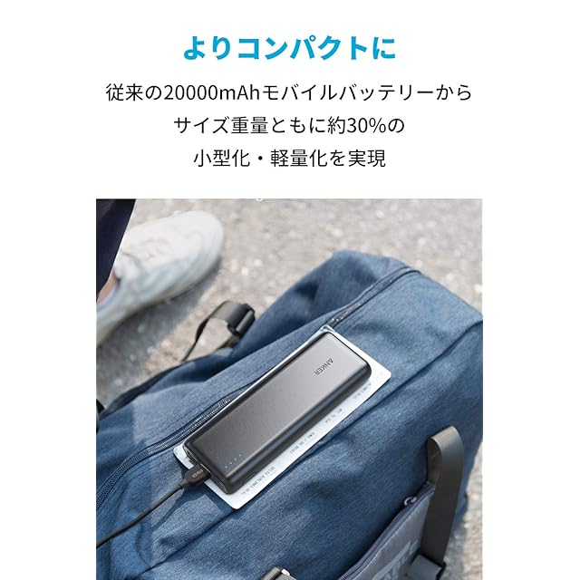 こんなに小さくなりました:従来の20000mAhモバイルバッテリーから、サイズ重量ともに約30%の小型化・軽量化を実現し、20000mAh以上のモバイルバッテリーでは、最もコンパクトで世界最軽量(2020年12月時点)。缶ジュース1個分(350g)ほどの重さしかありません。