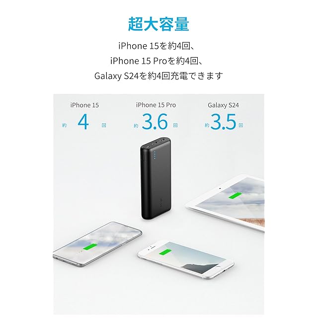 超大容量:20100mAhの大容量で、iPhone 15を約4回、iPad Pro (2022, 12.9インチ)に約2回の充電が可能です。