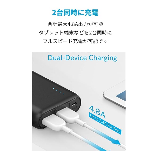 フルスピード充電技術:Anker独自技術PowerIQとVoltageBoostにより、フルスピード充電を実現。各ポート2.4A、合計で最大4.8A出力が可能です(入力:5V / 2A)。