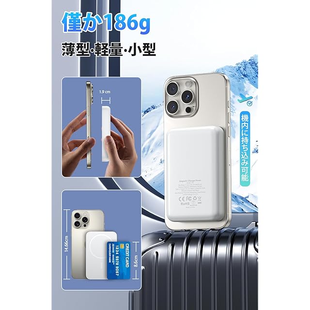 【マグネット式・くっついたまま充電可能】MagSafe技術を応用した磁気吸着式ワイヤレスモバイルバッテリー。内蔵の強力マグネットでスマートフォンにピタッと貼り付き、すぐに充電開始。10000mAhの大容量で日常使いや出張にも十分対応。ケーブル不要で持ち運びも快適です。重量はわずか186gと軽量・コンパクト。アウトドアや災害時にも頼れる心強い予備電源です。