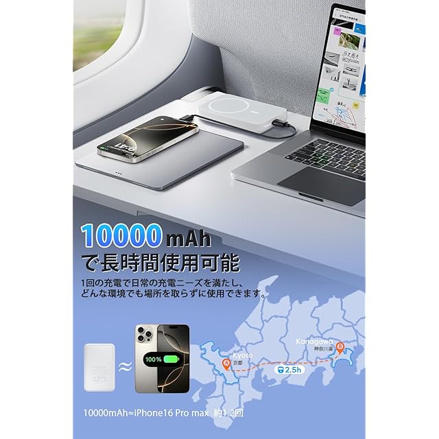 【10000mA大容量·飛行機内に持ち込み可能】モバイルバッテリー magsafe 最新的な大容量モバイルバッテリーですが、iPhone 15 Pro/14を約1.8回左右、iPhone 13mini/12miniを約2.6回左右、Galaxy S20を約2回左右することができます、ipad mini6を約1.4回左右さらに、USB-CポートはPD出力・入力両対応し、PD対応USB-C充電器を使えば、わずか2-4時間で充電器本体をフル充電できます。