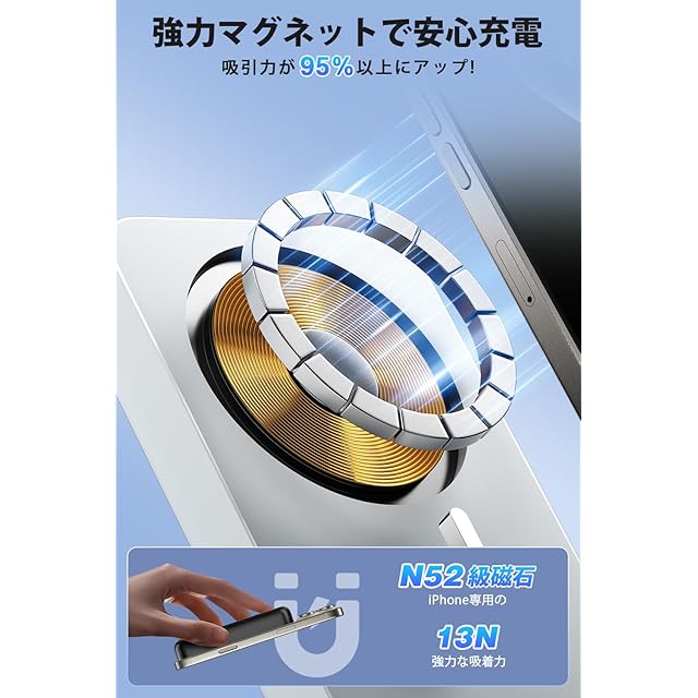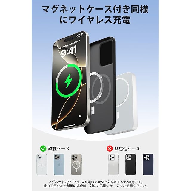 【ワイヤレス急速充電&マグネット式】MagSafe磁気吸着技術を採用し、強力な磁石でiPhone 16/15/14/13/12シリーズにピタッと吸着。最大15Wのワイヤレス急速充電が可能です。Qi対応スマートフォンも対応しますが、MagSafe対応ケースの使用を推奨。充電効率向上のため、ケースを外しての使用がおすすめです。