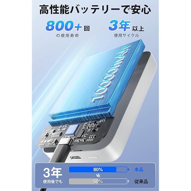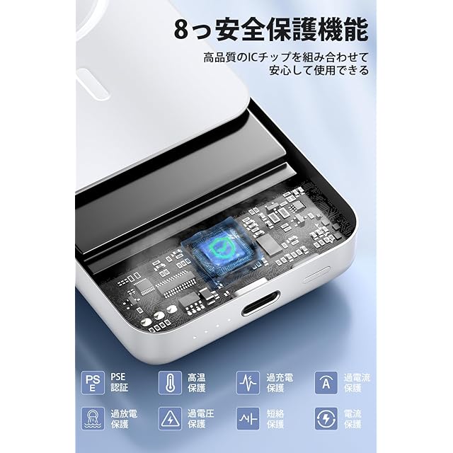 【PSE認証·多重保護システム装置】当社のモバイルバッテリーは高品質の内蔵バッテリーコアを採用し、過充電保護、過熱保護、過放電保護、過電圧保護、ショート保護など、複数の安全保護装置を備えており、モバイルバッテリーの安全性を確保しています。さらに、当社の製品はPSEの安全認証を取得しており、品質が信頼できます。パッケージには、マグセーフ モバイルバッテリー*1、Type-Cケーブル*1、日本語の説明書*1 が含まれています。製品をご使用中にご質問がある場合は、いつでもお問い合わせください。