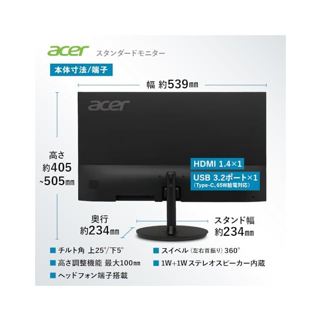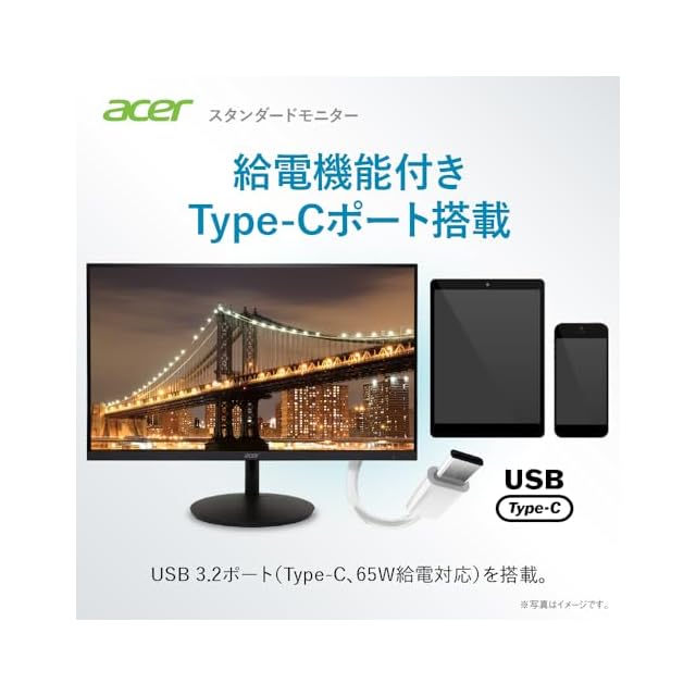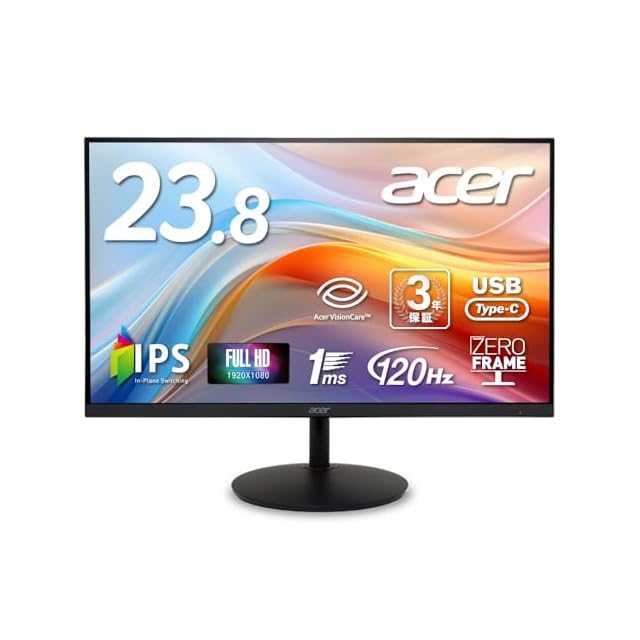 商品名:Acer モニター 23.8インチ フルHD 非光沢 IPS 120Hz 1ms(VRB) AdaptiveSync HDMI 1.4 Type-C・65W給電対応 スピーカー・ヘッドフォン端子 高さ調整 ゼロフレームデザイン 3年(パネルは1年) SH242YG0bmihux
