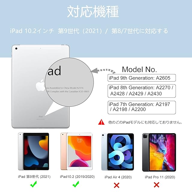 iPad 第9/8世代 2021/2020/第7世代 2019(モデルナンバー:A2197、A2200、A2198、A2270、A2428、A2429、A2430)専用デザインです。他のどのiPadモデルにも対応しておりません。