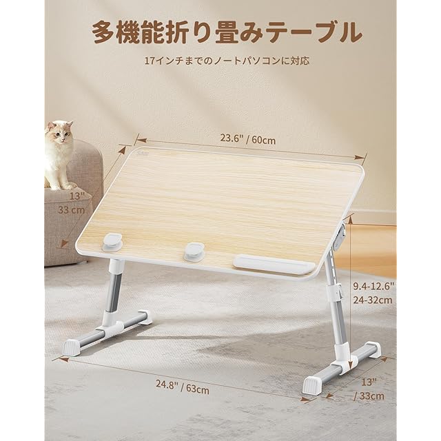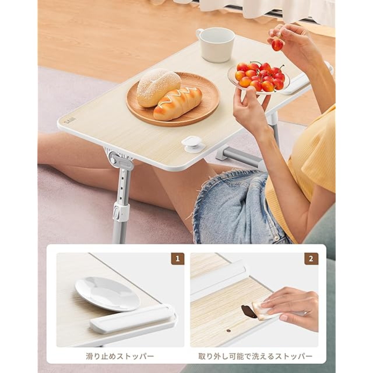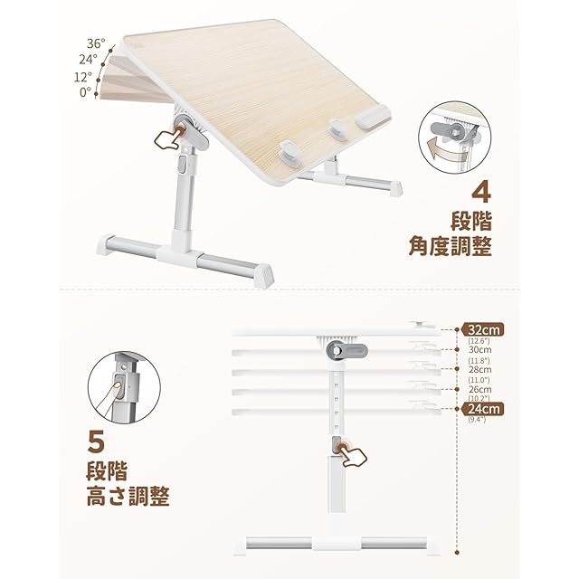 角度·高さを調節できるテーブル:高さ:5段階調整:24~32cm、角度は4段階:0~36°調整できる;天板の下広い空間がある両脚が自由に動けます。休日にノートpcで映画を見ながらベッドで過ごす時間を快適に。