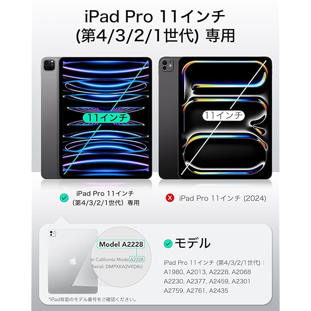 【互換性】:iPad Pro 11インチ(2022/2021/2020/2018、第4/3/2/1世代)に対応。モデル番号:A2435, A2759, A2761, A2301, A2377, A2459, A2228, A2068, A2230。ご注意:この製品はiPad Pro 11インチ M4(2024年、第5世代)とは互換性がありません