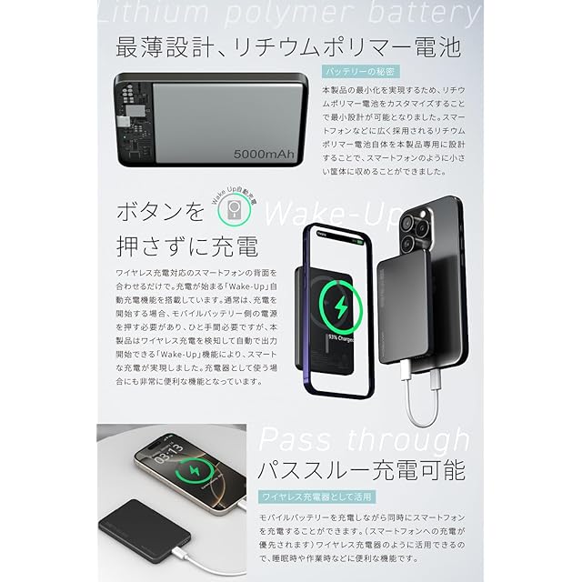 【ボタンを押さずに充電】ワイヤレス充電対応のスマートフォンの背面を合わせるだけで。充電が始まる「Wake-Up」自動充電機能を搭載しています。通常は、充電を開始する場合、モバイルバッテリー側の電源を押す必要があり、ひと手間必要ですが、本製品はワイヤレス充電を検知して自動で出力開始できる「Wake-Up」機能により、スマートな充電が実現しました。充電器として使う場合にも非常に便利な機能となっています。