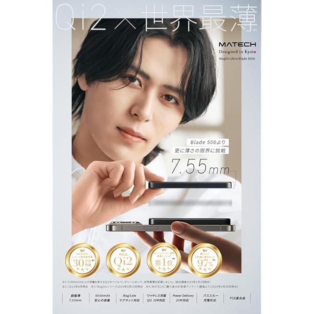 商品名:MATECH(マテック)® Qi2 モバイルバッテリー マグセーフ 超薄型 小型 軽量(史上最薄7.55mm, 5000mAh)【MagSafe対応マグネット式/アップグレード版/最大出力15W ワイヤレス/タイプC PD22W/iPhone12~16対応】(MagOn Ultra Blade 5000 ブラック)