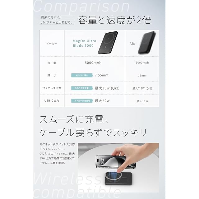 MATECH(マテック)® Qi2 モバイルバッテリー マグセーフ 超薄型 小型 軽量(史上最薄7.55mm, 5000mAh)【MagSafe対応マグネット式/アップグレード版/最大出力15W ワイヤレス/タイプC PD22W/iPhone12~16対応】(MagOn Ultra Blade 5000 ブラック)