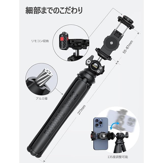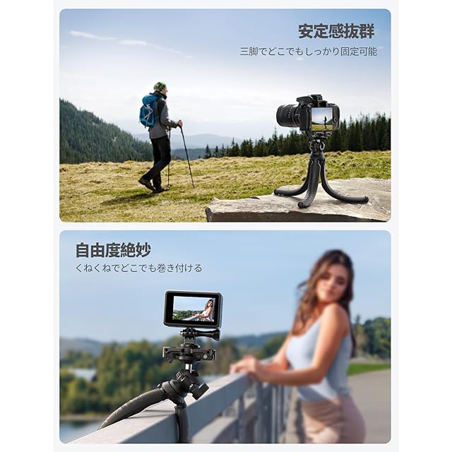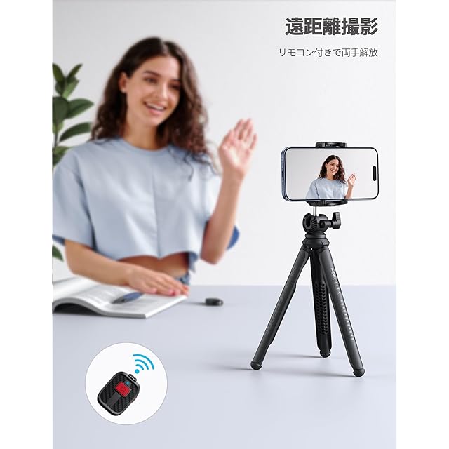 Lamicall くねくね スマホ 三脚 スタンド リモコン収納 : ミニ 三脚 携帯 ビデオ カメラ GoPro 一眼レフ フレキシブル 縦横 高低 360度調整 ワイヤレス 撮影 自撮り 滑り止め 軽量 持ち運び ABS樹脂 シリコン 旅行 卓上 頑丈 雲台 ブラック<p><b>【革新版グランプ・機能更新】雲台を外さなくても設備の転換自由!汎用の1/4ネジは可動ですので、ネジを押しましたら、すまほグランプ使用することができます。クランプの下部分のスイッチを開け、スマホの縦置き/横置き操作が便利!更新されたグランプは調整範囲が幅広くなります!厚さは20mmまで対応できますので、スマホケースやリングなど付けても使用できます。❗❗ご注意:保護ケースをつけたままに製品をご利用になる方が、ご購入になる前に是非全体の厚さをご確認ください。</P> <p><b>【幅広い互換性・対応機種】アダプター標準サイズのネジ山デザインで、ニコンやソニーなど様々なデジタルカメラに対応しています。スマホクリップとGoProアダプターが付きますので、カメラだけではなく、スマホとアクションカメラにも対応できます。スマホクリップは調整範囲が55mm-87mmで、厚さのは20mmまで対応できますので、約4-7インチ機種に対応可能。iPhone 15 iPhone14 plus pro promax 13 mini iPhone 12 mini Pro Max 11pro 11 XS XR X 8 plus 7 7plus 6s 6 6plus 5 5s se3 第三世代 Galaxy Xiaomi Redmi Note 8 9 10 pro mini p20 p30 lite Xperia キヤノン ニコン ソニー オリンパス ルミックス GoPro などに対応できます。</P> <p><b>【リモコン収納・遠離撮影】紛失を防ぐために改良版リモコンシャッターが付属し、グランプ両端のコールドシューに挿入して収納することができます。マイクやLEDライトなど色々なアタッチメントも取り付けて、撮影を楽しまれます!ワイヤレスリモコンはBluetoothでスマホと接続すれば、遠距離からでもシャッターを押すことができるようになります。一人の旅行で自撮りの時、家族全員の記念写真を撮る時、貴重な瞬間を逃がせずに大変役立ってくれています。※ヒント:本製品には電池を内蔵し、電池の規定貯蔵期間をご注意ください。</P> <p><b>【巻き付け自由・安定感抜群】スマホ三脚とくねくね兼用スタンドなデザインで、どんな形態でも設備の安全を守られます!ミニ三脚は高品質のアルミ製芯で作られ、表層は滑り止めのシリコンで補強されています。アウトドアなど段差や凹凸のある場所にも脚を自由に巻き付けられて、撮りたい角度に合わせます。それだけでなく、三脚スタンドとして卓上で会議/生放送/撮影など行うことができます。自由に折れ曲げられますので、デバイスの高さも調整できます。</P> <p><b>【360度回転雲台・角度ロック】360度回転可能なボールジョイントを採用し、お好みな角度に調整可能!スマホ三脚側面のネジを回転し、ボール型雲台を簡単に最大135°傾けることができます。</P> <p><b>【高品質素材・耐久性アップ】良質シリコンとABS樹脂で作成された高品質三脚スタンド!高品質のアルミ線内蔵で折り曲げを繰り返しても折れにくい、安定感は新品同様に保たれます。コンパクトで持ち運びや保管に便利で、カバンに入っても負担になりません。外出時に家族や友達と楽しい瞬間を記録するに欠かない良品です。山登り/旅行/卓上など色々なシーンで大活躍。
