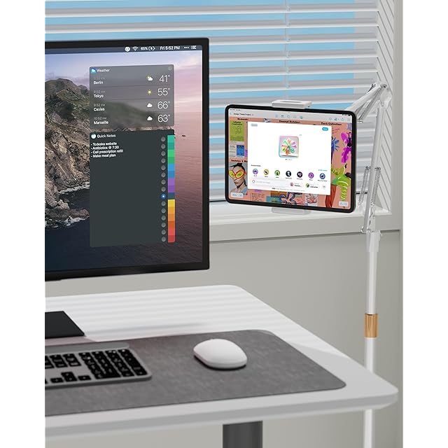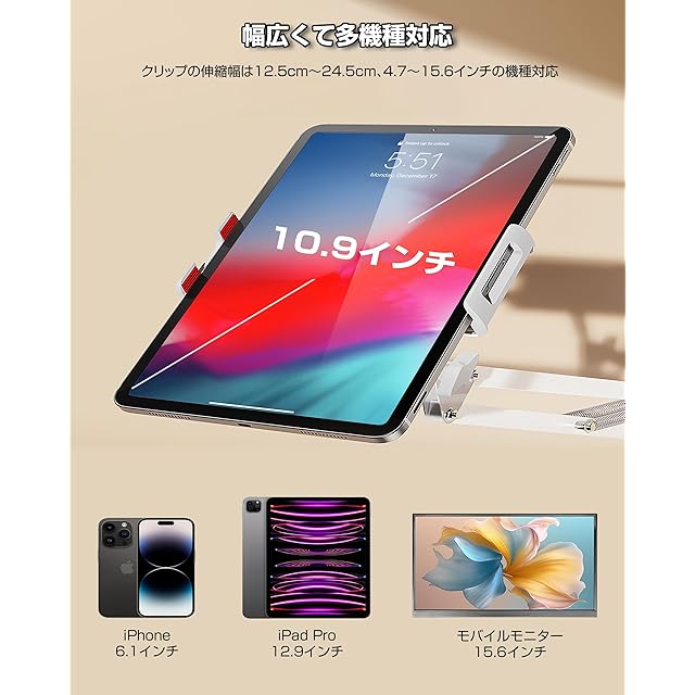 【充電穴用意・幅広い互換性】クリップの伸縮幅は12.5cm~24.5cm、4.7~15.6インチのiPad,Ari,Mini,Proシリーズ全機種/iPhoneシリーズ全機種/ Android Phone/Android pad/SONY phone/Kindle/Switchなどに対応可能です。それにも、クリップ両側に充電穴を用意があり、スマホ端末に充電したままにご利用可能です。(※:長さが12.5cm(最小)~24.5cm(最大)、厚さが14mm以内の機種のみ対応。最大耐荷重1.5kg。載せた端末はアームの最大耐荷重を超えれば、アームが垂れてくる可能性があります。ご承知ください。)