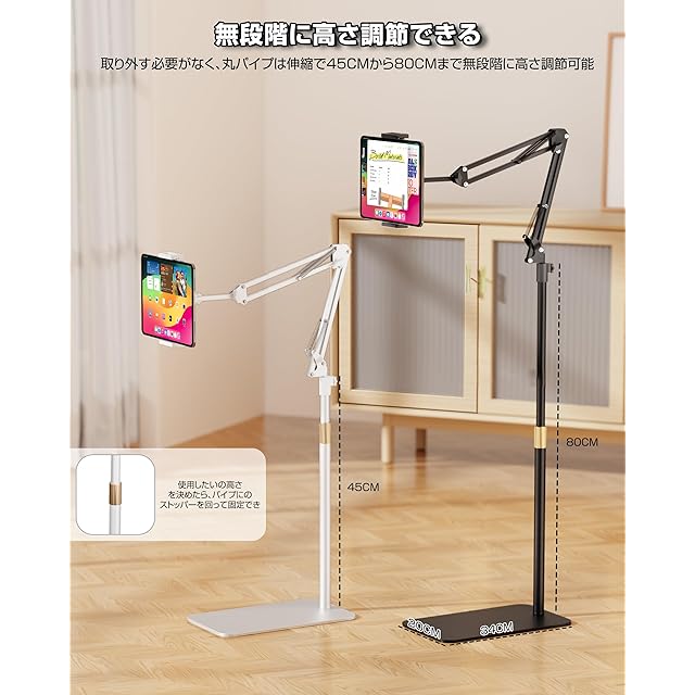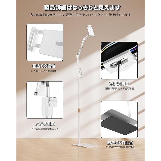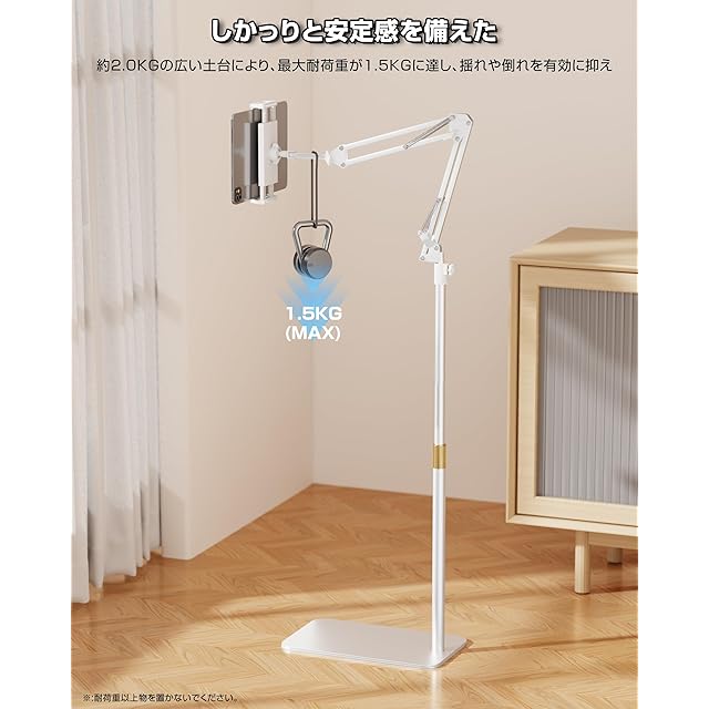 商品名:タブレット スタンド 伸縮式フロアスタンド iPadアーム 床置き 寝ながら 50-150cm高さ調整 角度調整 4.7-15.6インチ対応 360°回転 土台強化 下垂防止 スマホ/タブレット/モバイルモニタ対応 (ホワイト)