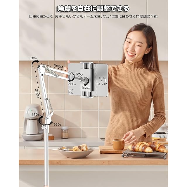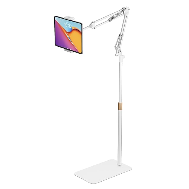 タブレット スタンド 伸縮式フロアスタンド iPadアーム 床置き 寝ながら 50-150cm高さ調整 角度調整 4.7-15.6インチ対応 360°回転 土台強化 下垂防止 スマホ/タブレット/モバイルモニタ対応 (ホワイト) | TREND DESIGN 家電専門店