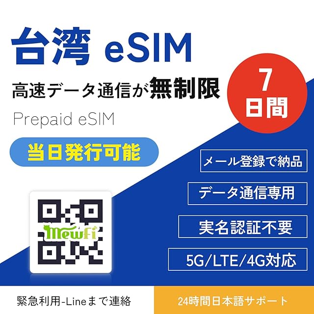 商品名:【台湾 eSIM】7日間 高速データ通信は無制限 データ通信専用 台湾SIM eSIM 当日発行可能 メール登録で納品 お急ぎの方(LINE相談受付中)QR簡单設定 Taiwan SIM mewfi