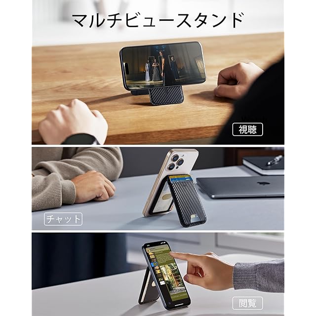 [ESR] 2025新登場収納量アップ MagSafe カードケース 5枚カード RFIDブロッキング機能 角度調節可能スタンド付き iPhone用マグセーフ カードケース スリム iPhone 16/15/14/13/12シリーズ用 Mini非対応 ベジタンレザー カーボンファイバーブラック | TREND DESIGN 家電専門店