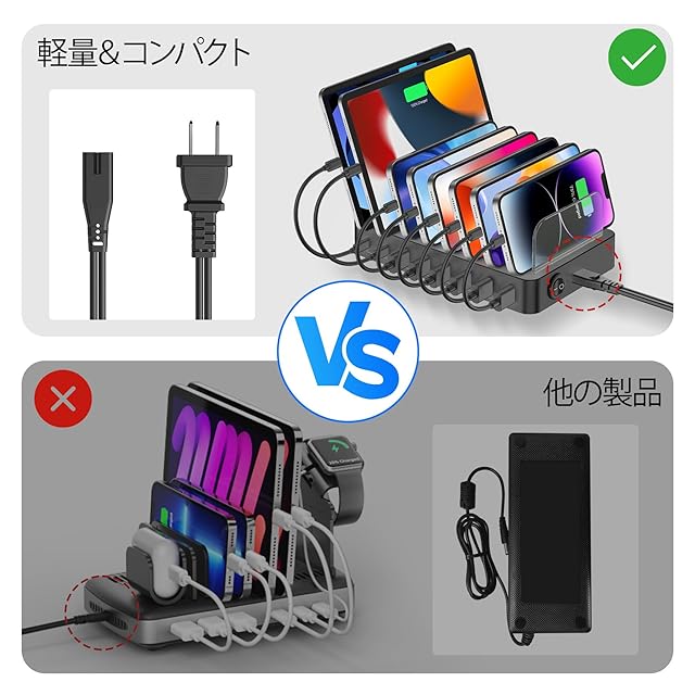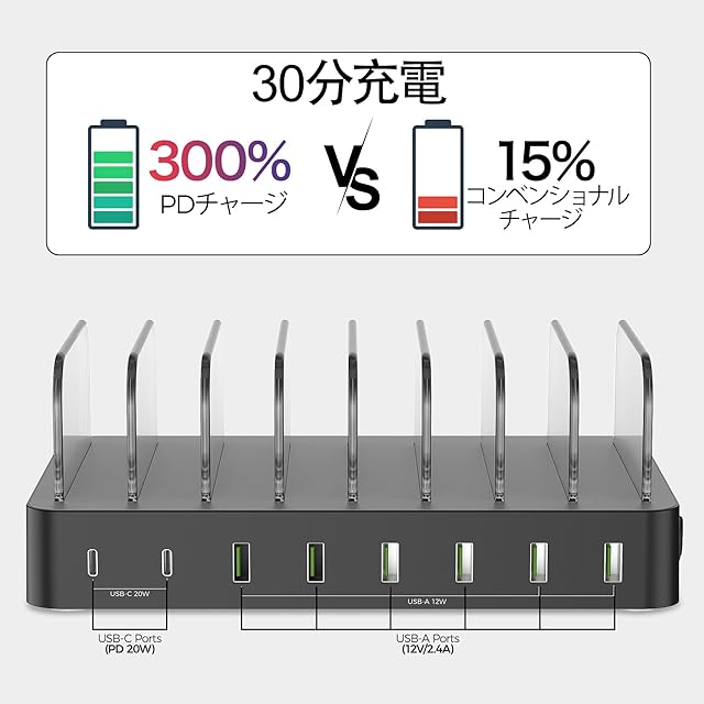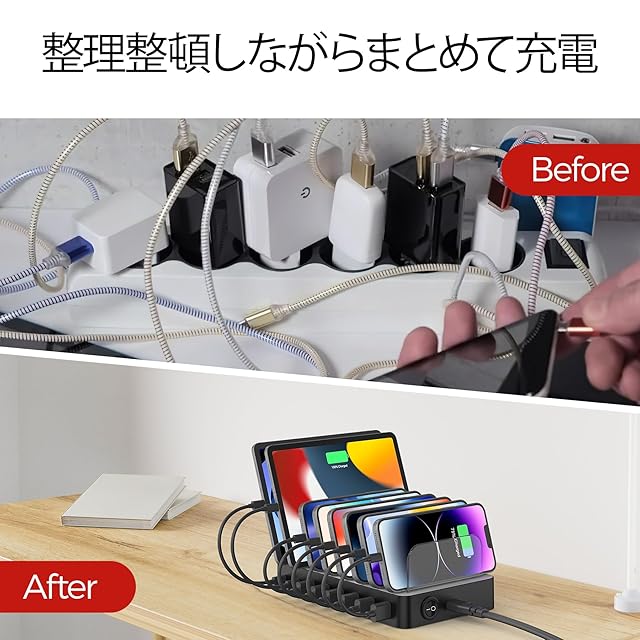 取り外し可能な仕切り:このUSB充電ステーションには、取り外し可能な仕切りが特徴であり、7つの透明なバaffle(仕切り板)が付属しています。Apple Watch用のホルダー(iWatch充電器は含まれていません)も付属しており、すべての電子デバイスを一か所で充電することができ、清潔で整理された状態を保つことができます。