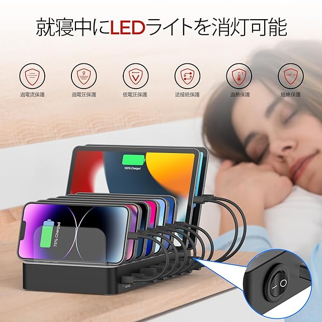 完全保護:このマルチデバイス充電ステーションは、各デバイスのニーズに応じて電流をスマートに識別し、分配します。過熱、過電流、過電圧、ショート回路保護機能が搭載されており、あなたとあなたのデバイスの完全な安全を確保します。