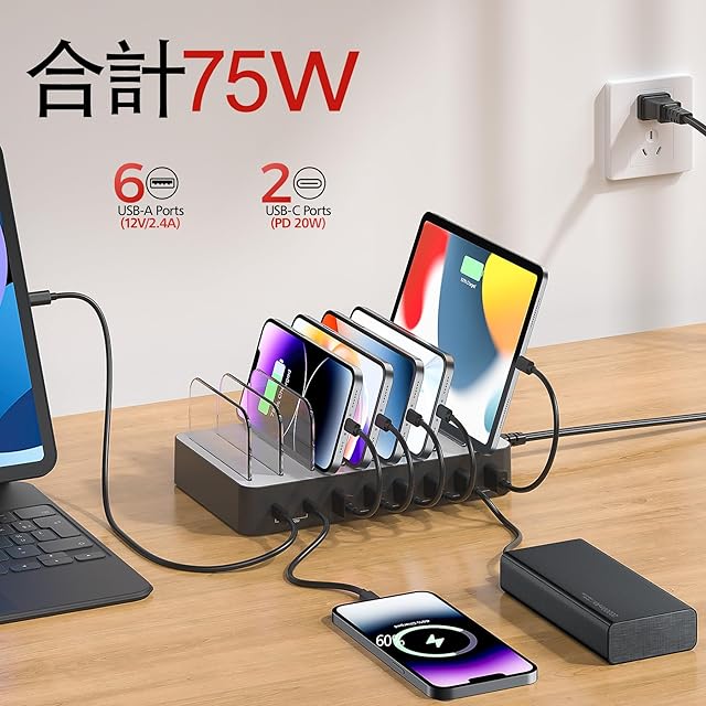 Unitek 2025 USB PD充電ステーション 8ポート PD20W*2+USB A*6 卓上充電スタンド 75W 8台同時 1.5A/2.4A/3A スマートIC搭載 複数台対応 Android/iPhone/iPad/kindle/タブレット/PSP/ラップトップ 仕切り板 間隔調整可能 収納便利 卓上 プレゼント