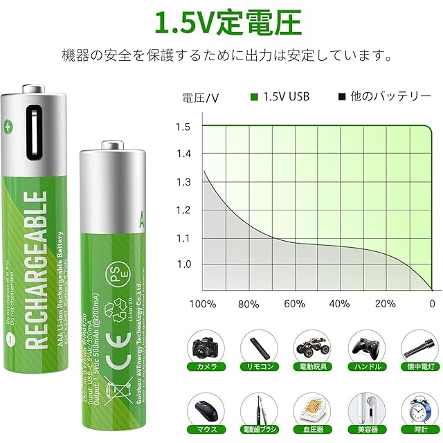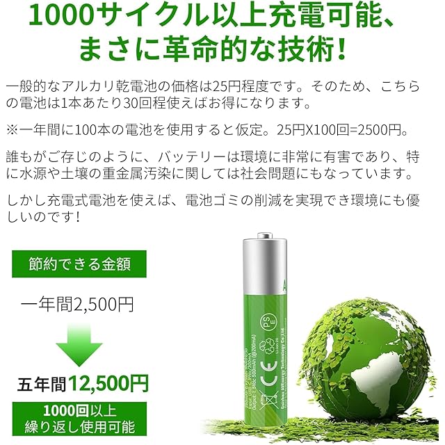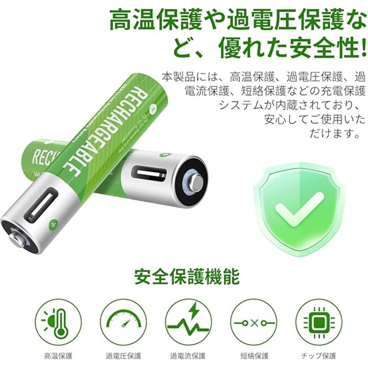 【安全保護】単4形充電池には複数の保護システムが組み込まれており、充電時の過充電や過放電などの安全リスクを回避し、日本の電気製品安全法や技術基準に対応しており、使用者の安全を保障します。充電式電池はHg/Cd/Pbを含みまず、環境に害を与えません。