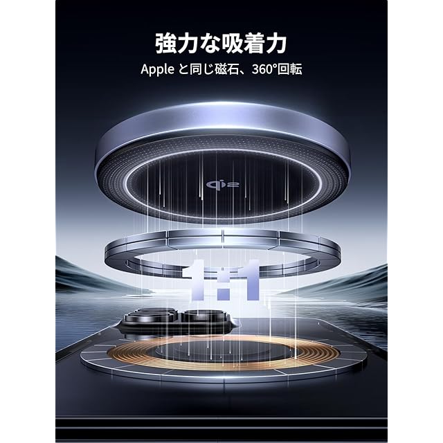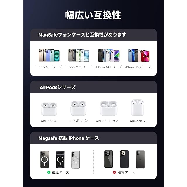 【幅広い互換性】: iPhone 16/16 Pro/15 Pro Max/14/13/12シリーズ、AirPods Pro 3/2/1、AirPods3/2、およびほとんどのQi対応デバイスと互換性があります。MagSafeが組み込まれていないスマートフォンの場合は、シームレスに接続してMagSafe対応のケースで充電できます。