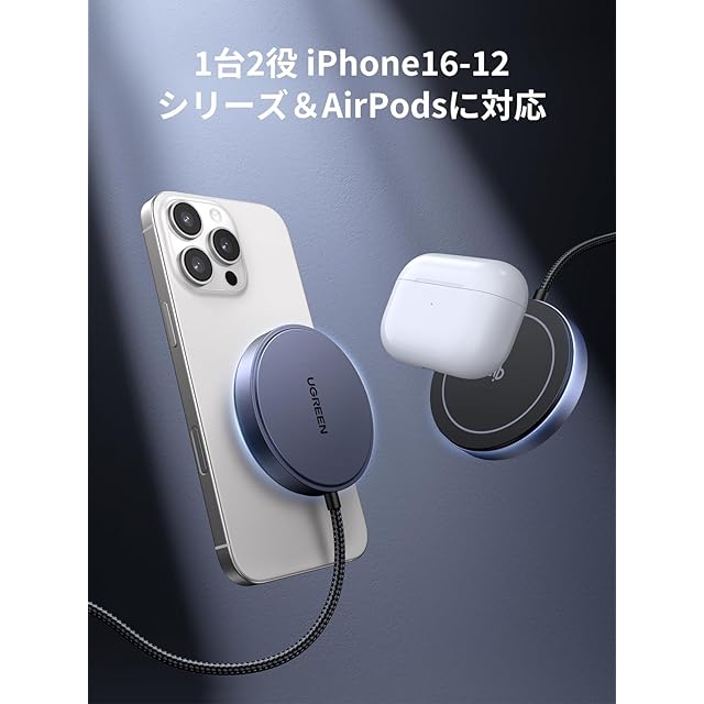 【1台2役※ワイヤレス充電】UGREEN MagFlow ワイヤレス充電器がiPhoneをワイヤレスで充電(15W)できるほか、AirPodsにも対応する。マグセーフ対応、オリジナルの Apple 充電器と同じ充電速度。