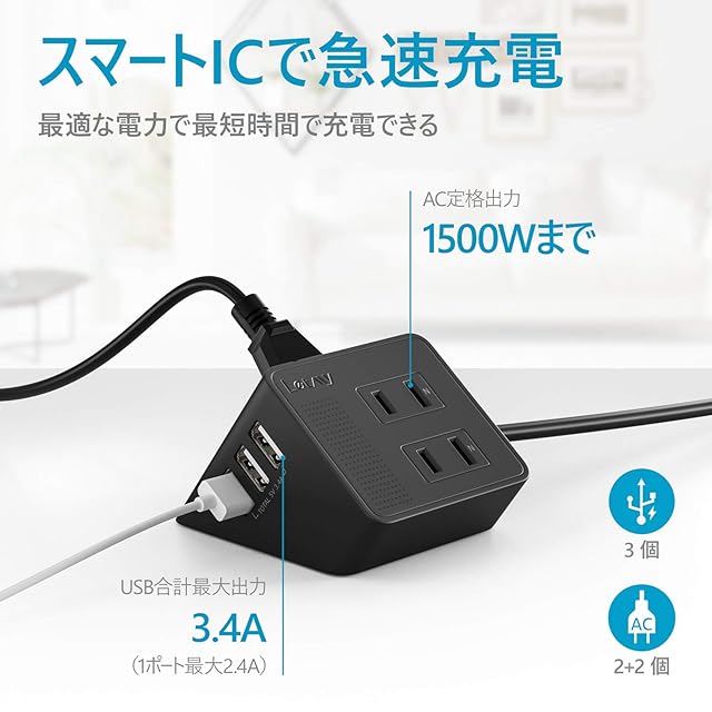 ✔【1台7役】このたこあしコンセントは4つAC差込口と3つUSBポートの組み合わせ、コンセント不足を解消!電源タップは各USBポート最大2.4A急速充電可能で、合計3.4A出力できます。本コンセントタップはUSBポートがスマートIC搭載だから、接続機器を自動検知し、最適な電流で充電を行います。