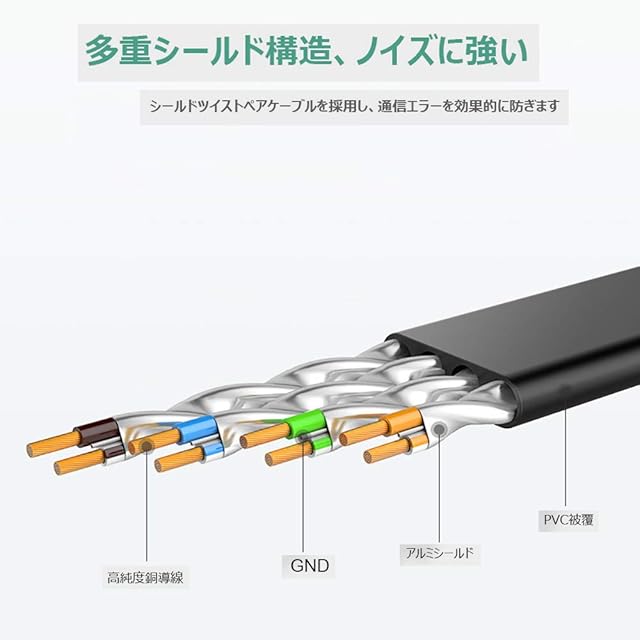 特徴:両端コネクタ付(8芯 鍍金RJ45 スリムコネクタ採用)。内蔵100%裸銅線(シールドケーブル)、最小ノイズと混信をします。。ツメ折れ防止カバー、曲げても折れない。ノイズ干渉も強い、高速で安定した。