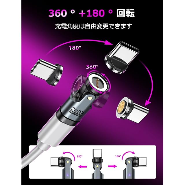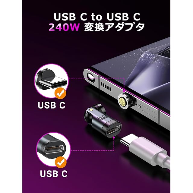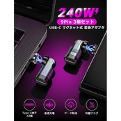 【5A超急速充電 & 240W・USB-C 変換アダプタ】240W・PD対応なUSB-C 変換アダプタが登場! マグネット式USB-C変換アダプタとはコネクタ部分を予めデバイスに装着しておき、充電時はケーブルを近づけるだけでマグネットでピタッと接続され、充電が開始する新型充電ケーブルです。<br><br>【480Mbps超高速データ転送】 480Mbpsの超高速データ転送のマグネット式USB-C変換アダプタは、音楽、写真をわずか急速に転送できます。ご注意:映画、HD動画、ビデオなど転送できません、ご注意ください。<br><br>【540°回転設計&充電便利に】9ピンのマグネットUSB C変換アダプタに付くのマグネット充電端子は【180°+360°】回転可能のため、充電しながらゲームをしたり、動画を見たりする際、コネクタの接続部分が邪魔にならず、快適に楽しむことができます。充電しない時、磁気コネクターは防塵カバーとして活躍になり、コネクタも綺麗に保ちしております。<br><br>【お買取く内容】9Pinマグネット式・USB-C 変換アダプタX2個、9Pin専用・Type-C端子X2個、端子抜き工具X1個。<br><br> 【ご注意】PD240W高速充電ご希望場合、デバイス、充電器、充電ケーブルは全部240Wがサポートします。<br><br>