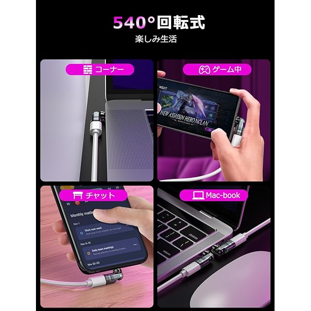 【540°回転設計&充電便利に】9ピンのマグネットUSB C変換アダプタに付くのマグネット充電端子は【180°+360°】回転可能のため、充電しながらゲームをしたり、動画を見たりする際、コネクタの接続部分が邪魔にならず、快適に楽しむことができます。充電しない時、磁気コネクターは防塵カバーとして活躍になり、コネクタも綺麗に保ちしております。