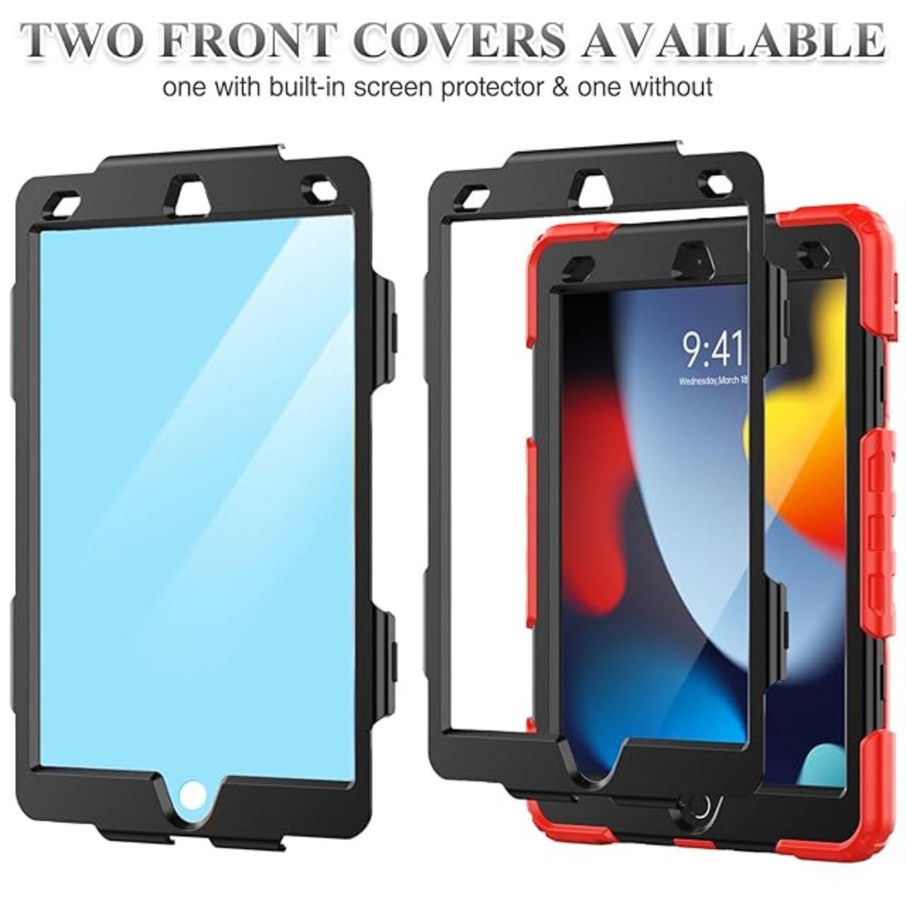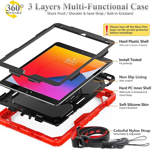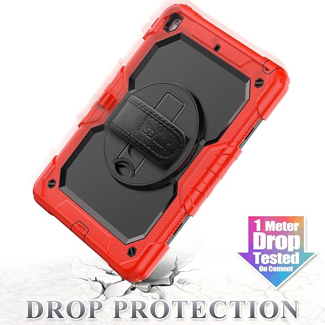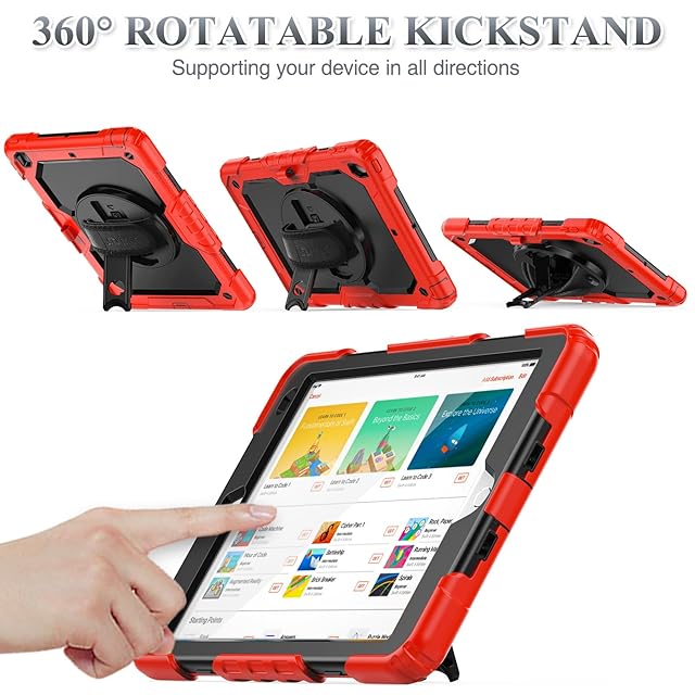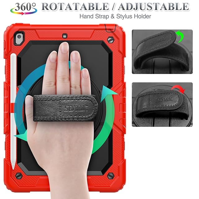SEYMAC stock iPad 10.2インチ 第9世代/第8世代/第7世代 ケース 耐衝撃 保護フィルム付き ペン収納 360°回転スタンド ハンドストラップ ショルダーストラップ 全面保護カバー (レッド+ブラック) | TREND DESIGN 家電専門店