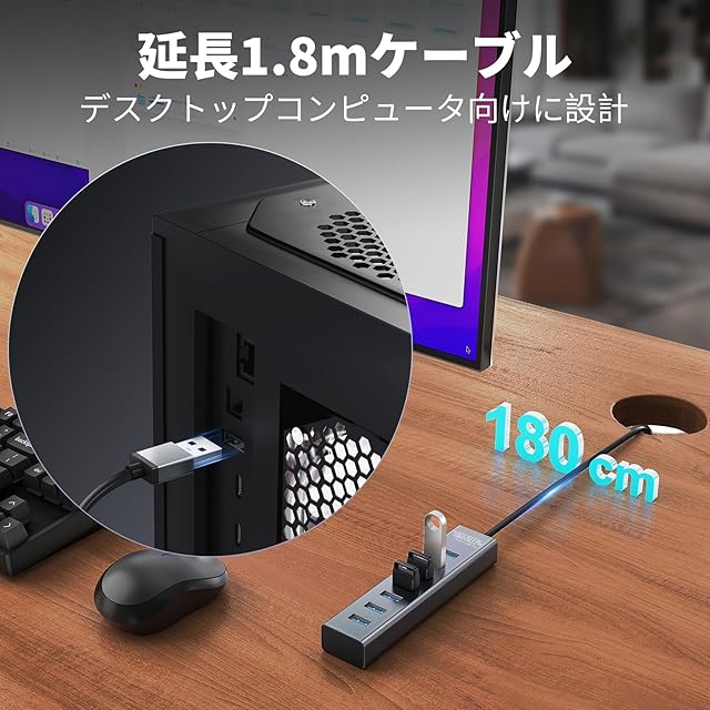 商品名:1.8m 7ポート USB 3.0 ハブ デスクトップ用 - アルミニウム製 USB Hub 5Gbps, 長いケーブル対応(180cm)PC、フラッシュドライブ、外付けHDD、マウス、キーボード、Windows/XPS向け
