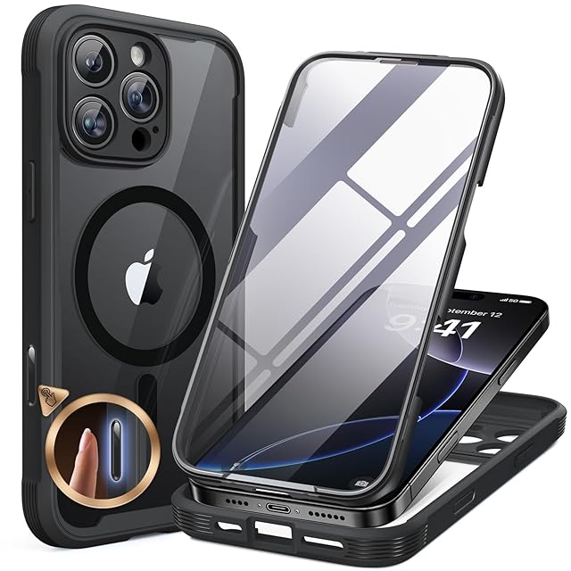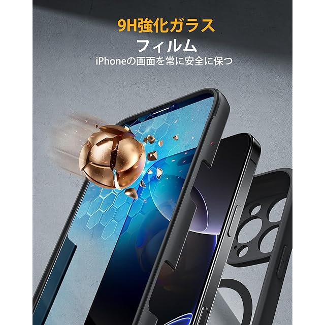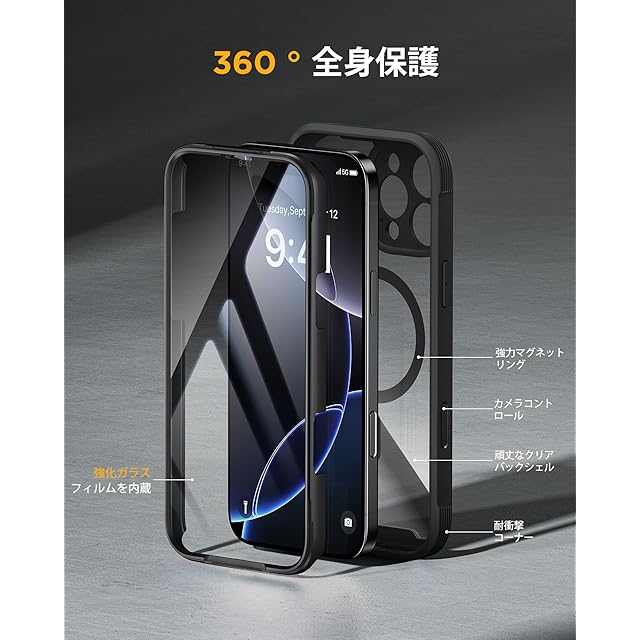 Miracase iPhone16pro ケース MagSafe対応 スマホケース いPhone16pro 用 カバー 9H 強化ガラス 360°保護 全身バンパー保護ケース 6.3インチ フルカバー ワイヤレス充電対応 マグセーフ対応 マグネット搭載 黒 | TREND DESIGN 家電専門店