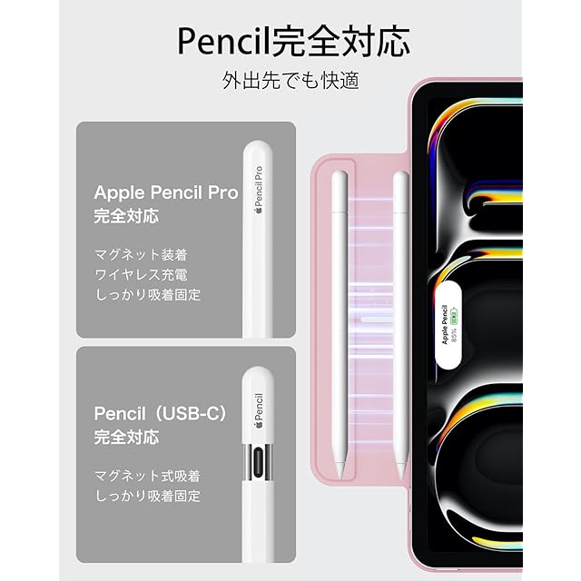 【Pencil Pro&Pencil (USB-C)対応】:Pencil Proへ完全対応かつ、磁気充電用の側面の溝と、Pencilをしっかりと固定するマグネットクラスプを備えています