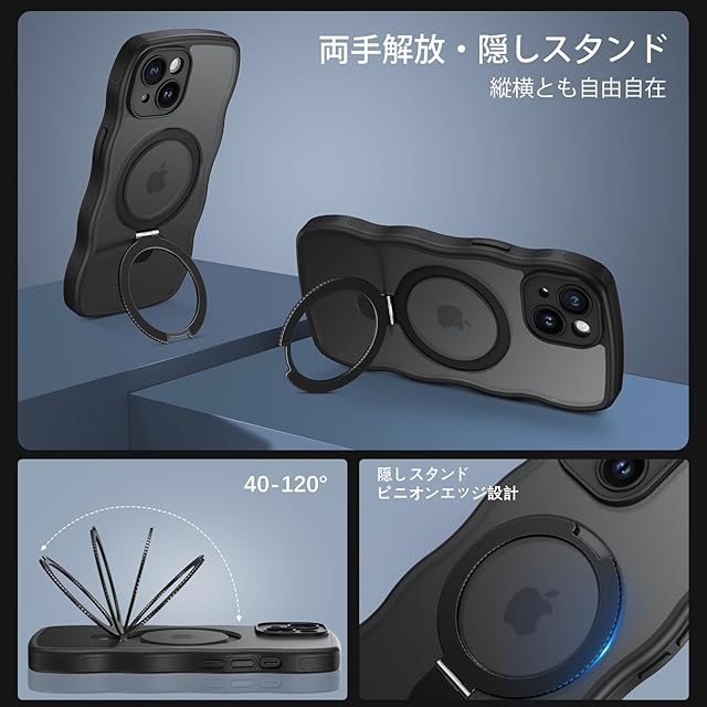 <br>【商品詳細】 <br>カラー:ブラック <br>材質:TPU+PC <br>対応機種:iPhone 15 <br>商品名:iPhone 15ウェーブ 回転スタンドケース <br> <br>【特長】 <br> 【iPhone 15 に対応 】 <br> 【回転スタンド+超軽量&スリム&ワイヤレス充電】 <br> 【透明の魅力デザイン 細部まで豊かに】 <br> 【簡単装着・ワイヤレス充電がもっと楽に 指紋を防ぎ、汚れや黄ばみを防ぎ】 <br>【落下や衝撃による損傷を軽減します 全面保護-もしもの時も安心】