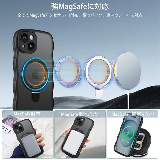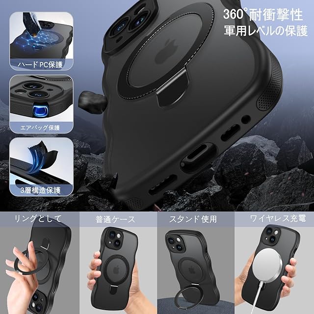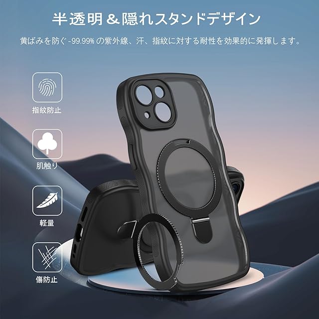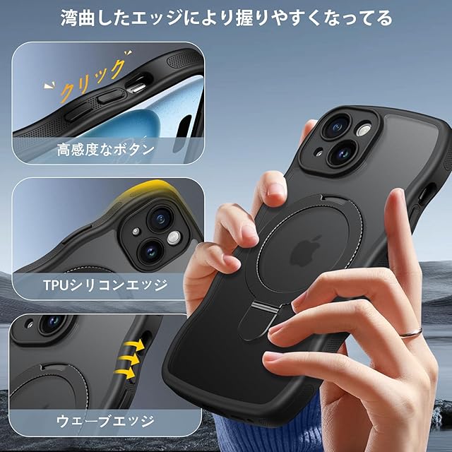 商品名:[ウェーブ&スタンド]GUAGUA いphone 15 ケース クリア ウェーブ iPhone15 ソフト TPU うねうね ケース マット 人気 韓国 耐衝撃 超軽量 薄型 おしゃれ 黄ばみなし スマホケース いphone15 ワイヤレス充電 ストラップホール付き 15 金属キックスタンド カバー( ブラック )