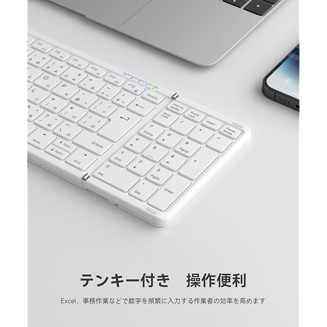 ✅【折りたたみ式&テンキー付き】モバイル キーボード は折り畳み式でバッグへ簡単に収納でき、持ち運び便利。また、大型テンキー搭載、Excelや会計ソフトなどで数値を入力しやすくて、事務効率を高めます。財務担当者、データ分析者など、数字を入力する機会が多い方に最適です。