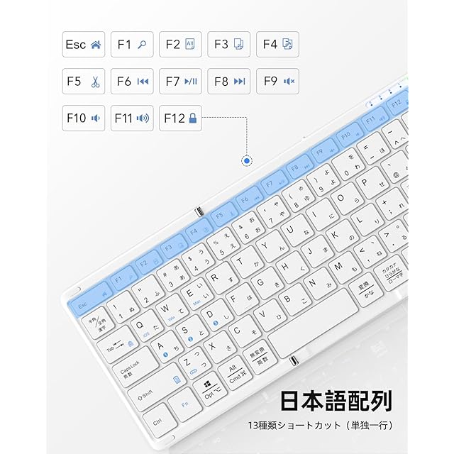 ✅【標準JIS配列&単独一行ファンクションキー】折りたたみ キーボードは標準日本語配列でかな入力もローマ字入力も対応できます。また、単独一行のファンクションキーで、一つのキー押すだけでコピーや切り取り、貼り付けなどを実現でき、タイピング中都度手を止まる必要がありません。超便利!