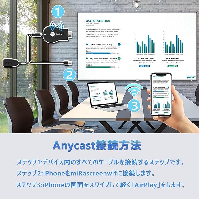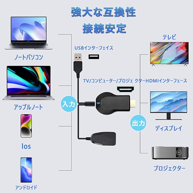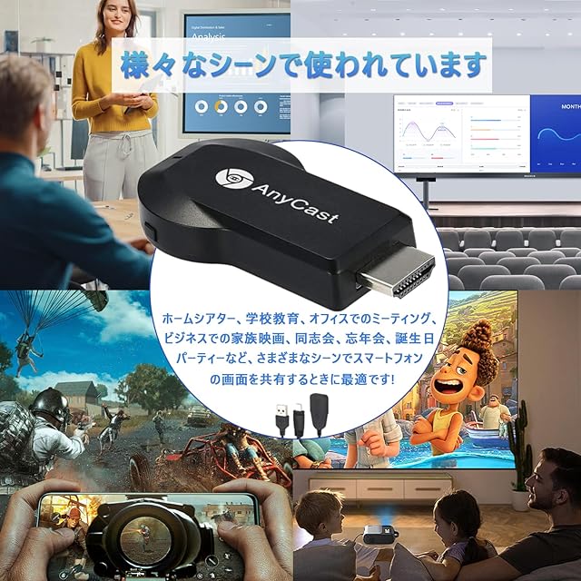 【広く活用場所があり・品質】この新発売のエニーキャストはWIFI環境があってもなくてもご利用いただけます。日常生活で広く使われています。ホームシアター、学校教育、オフィスミーティング、ビジネス商談、家庭映画、店のテレビを見る、ゲームのプレイ、忘年会、パーティーなどをサポートします。HDMIミラーキャスト このエニーキャストはご購入日から12ヶ月間品質があり、万が一、商品の初期不良や故障が起こった場合、レビューする前にご連絡を頂けるとすぐにご交換やご返金にてご対応させていただきます。