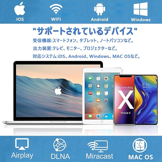 【iPhone/Android対応・強大な互換性があり】このワイヤレス ミラーリングは携帯/タブレット/ノートブック(iOS8.0以降/ Android 6.0以降/ Windows 8.1以降)のすべての機器と互換性があります。アイフォンはもちろん、Androidスマホの画面をテレビに映すこともできますし、macOS 、Windowsにもミラーリングサポートします。Miracast、Airplay、DLNA、EZmiraプロトコルと互換性もあります。