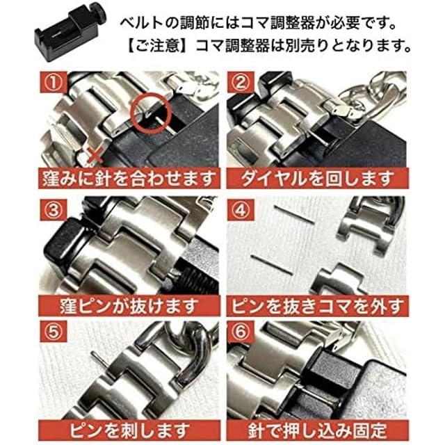 【硬めの作りで落下防止】落下を防止するため、ロック式の留め具は硬めの作りになっています。 使用していく中で次第に開閉しやすくなります。※コマ調整は、必ずベルト側面のピン穴が窪んでいる方からベルト裏面の矢印の方向へ向けて針を刺して下さい。反対側からは脱落防止のため抜けない構造となっております。※コマ調整器は別売りとなります。