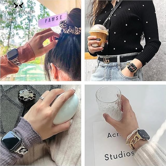 【全機種対応】対応機種:Apple Watch Series 10 , 9 , 8 , 7 , 6 , 5 , 4 , SE ,Ultra 2.1 /サイズ:40 . 41 . 42 . 44 . 45 . 46 . 49mm対応 / ご希望のサイズをお選びください。 ※コマ調整でサイズ調整可能 / 付属品:輸送保護用ボックス※コマ調整器とアップルウォッチ本体は付属しません。1コマあたり8.5mm調整可能。最大6コマ=5cmの調整が可能。 / ご注意:ご自身でのコマ調整の際は、破損、お怪我にご注意ください。コマ調整器を使用したことがなくご心配な方は時計店での調整をおすすめいたします。【高級感溢れるバンドで華やかに】動くたびにブレスレットが輝き、適度な重みが高級感を演出します。手首につけるだけでオシャレ度がグッと上がり、ビジネスからカジュアルな場面まで幅広いシーンでお使いいただけます。【ステンレススチールを採用】合金ではなくステンレススチールを用いたチェーンブレスレット。ステンレススチールの磨き上げられた美しいデザインが特徴で、チェーンはポリッシュ加工、コマは高品質サテン仕上げとなります。リング状のチェーンは通気性も抜群です。【ギフトやプレゼントに】Apple Watchをおしゃれに彩る人気のステンレスチェーンベルト。シルバーアクセサリーとしても使用でき、ご家族や友人、恋人などへ贈る誕生日、お祝いのギフトなど、プレゼントにもおすすめです。【硬めの作りで落下防止】落下を防止するため、ロック式の留め具は硬めの作りになっています。 使用していく中で次第に開閉しやすくなります。※コマ調整は、必ずベルト側面のピン穴が窪んでいる方からベルト裏面の矢印の方向へ向けて針を刺して下さい。反対側からは脱落防止のため抜けない構造となっております。※コマ調整器は別売りとなります。【必ずお読みください】 1.ステンレスは金属アレルギーを起こしにくい素材ですが、体質によって、かゆみ・かぶれを生じる場合がありますので、皮膚に異常を感じたときは、ご使用をお止めいただき専門医にご相談ください。金属アレルギーが心配な方は、皮膚科にてパッチテストなどのアレルギーテストを受けられることをおすすめします。?ご購入後のアレルギー反応に関しまして責任は一切お受け出来かねます。あらかじめ、ご了承ください。金属アレルギーの方はご使用しないで下さい。 2.力仕事や激しいスポーツをする時、就寝時や幼児の世話をする時など、身体に危害を及ぼす場合がありますのでジュエリーをはずしてください。 3.サウナ等高温の場所、あるいはスキー場等極寒地でのピアスなどのジュエリーの使用は、火傷、凍傷の原因となる場合がありますので、着用しないでください。【商品タグについて】製造時期により、製造委託工場のロゴ(handodo)が記載されていることがございますが、ROYCE&ROLANDの商品であり商品品質などこれまでと変わるものではございません。2023年11月以降に製造されるものから全て再度ROYCE&ROLANDに統一されます。