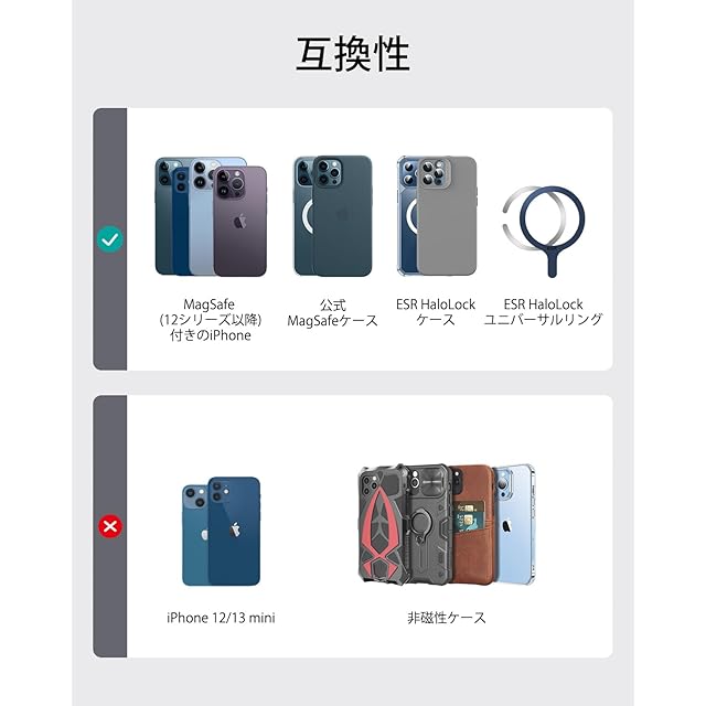 【互換性】:iPhone 16/15/14/13/12シリーズ、公式マグネットケース付き機種、ESR HaloLockケースのみ対応です。iPhone 13/12 miniは非対応です。