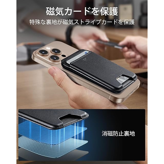 商品名:[ESR] 2025新登場収納量アップ MagSafe カードケース 5枚カード RFIDブロッキング機能 角度調節可能スタンド付き iPhone用マグセーフ カードケース スリム iPhone 16/15/14/13/12シリーズ用 Mini非対応 ベジタンレザー ブラック