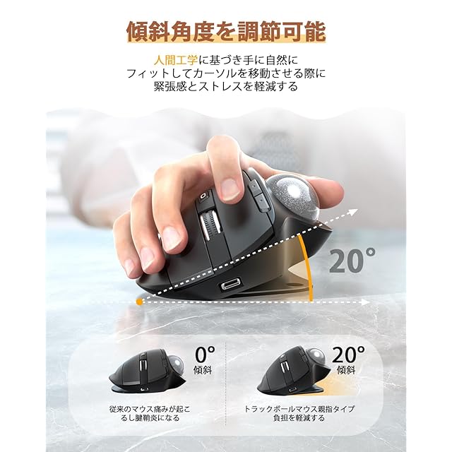 ✋傾斜角度を調節可 トラックボールマウス✋ 人間工学に基づいた親指操作のエルゴノミックデザインで、20度の傾斜をかけたポジションにできる角度調整機能揃えたトラックボールマウスです。底面のマグネット板がついており、業界内の一番MX ERGOのように、本体の傾斜を0°と20°を調整可能なボールマウスです。これにより、手首の角度が自然になります。マウス本体を動かさずに操作でき、使いやすい親指タイプトラックボールです。無線タイプで、膝の上など平らではない場所でも、好みの姿勢を取ることができます。34mmボール滑らかなボールが搭載されており、本体が大きく、滑らかな操球感、エルゴノミクスデザインされた使いやすいトラックボールです。長時間のPC作業をしているお客様はぜひ。