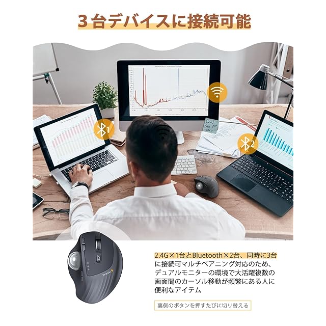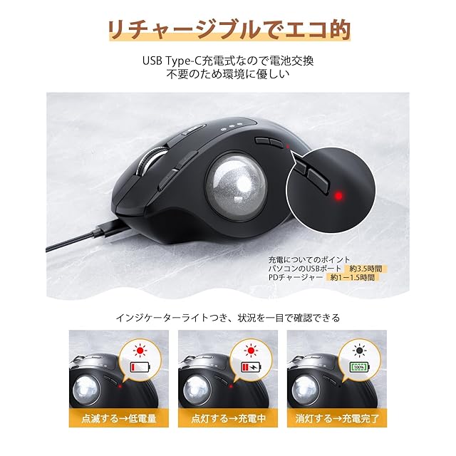 通常のマウスでは体験できない独特の操作感で、使い慣れてしまうと通常のマウスには戻れないほど手に馴染みます。<br> 慣れやすい<br> 「親指タイプ」のトラックボールは通常のマウスと同じように、人差し指に左クリック、中指に右クリックがあります。カーソルの移動が親指側のボールに切り替わるだけなので、操作は簡単なUSBトラックボールマウスです。 手の掌にフィットする部分は、摩擦をつけて滑らないように柄がついており、とても握りやすいです。<br> 省スペース<br> ワイヤレスマウス本体の移動がないため、狭い場所でも不自由なくポインター移動出来、場所の制約がある場所では大活躍です。 車、バス、新幹線、飛行機の中でも、マウスを膝の上やシートテーブルに置いて使えます。<br> 優れた静音性<br> トラックボールの感度が良く、押し心地も最高です。「カチカチ」という操作音が無いため、周囲に迷惑をかけることなく、自身も勉強や仕事に集中できます。 自宅、図書館、喫茶店、オフィスなどの公共の場所で大活躍する無線タイプのトラックボールです。<br> 充電が長持ち<br> 900mAh大容量の充電池を搭載しているため、一度フル充電したら、連続使用約120時間可能です。 電池交換は不要で、付属のtype-cケーブルで充電出来ます。 裏側に電源ボタンあり、使わない時電源オフにする可能で、ランニングコストが低い充電式トラックボールマウスです。<br> 腕と指のつかれをけいげんする<br> 手首も腕も、トラックボールマウス本体も動かすことなく、パソコンの作業が快適になります。<br> 移動速度をカスタマイズできる<br> ボールの触感がよく、ボールコントロールが1000-1600-2400DPIの精度でマウスポインターの速度調整できて、とても使い易いマウスです。<br> 簡単に設定<br> Bluetoothと2.4GHzの両方が使えるので、ソフトをダウンロードすることがなく、USBレシーバーを挿すだけで、 接続方法もBluetoothまたはUSBレシーバーを使って選択可能で、柔軟に使い分けができます。 ベースがしっかりおり、操作の安定感が抜群です。<br> 無線タイプ制限なし<br> パソコンを使ってのプレゼンや、パソコンのモニターで離れて映画を観るときにも使いやすいです。<br>