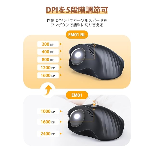 EM01から一層の進化を遂げたEM01NLが着弾 FacebookやTwitterやYoutubeなどのSNSでも評判がよく、大人気のProtoArc EM01トラックボールマウスからアップデートした「進化版」の無線トラックボールマウスです。 P1【LEDイルミネーションが無駄なバッテリー消費に繋がる】などの声が多かったため、検討した上で、ボールマウスのLEDリング状は光らないようにして、バッテリー持ちの時間が長くなりました。 P2 DPIを1000・1600・2400の3段階から200・400・800・1200・1600の5段階までアップデートしており、ポインターのスピードを手元で変更でき、ニーズによって、細かな調節ができるようになりました。 P3【トラックボールが本体とこすれて引っかかる】のような指摘を頂き、内側の筐体を繰り返し修正し、スムーズな操球感を求めています。 Point4.マウスの本体に搭載されているBluetoothのバージョンも4.2から5.0にアップデートされて、接続がより安定し、通信範囲もより広くなり、電池の持ち時間も使用寿命ももっと長くなります。