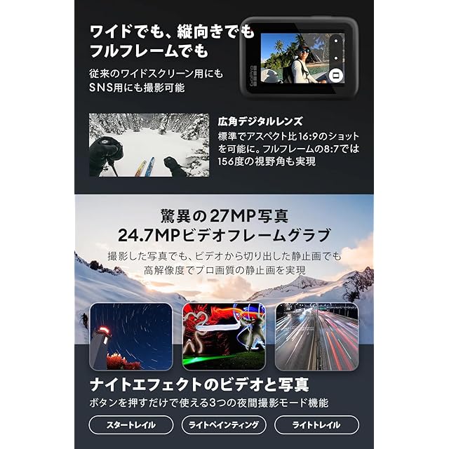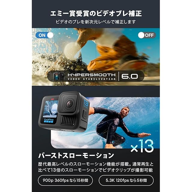 【バーストスローモーション】HERO13 Blackには、歴代最高レベルのスローモーション機能が搭載されており、通常再生と比べて13倍もスローなスローモーションでビデオクリップを撮影できます。最大5.3Kの解像度で4倍スローモーションの短いクリップを撮影すれば、肉眼では追えないディテールを捉えることもできます。【クラス最高レベルの5.3Kビデオ】5.3Kビデオの息をのむような美しい画質。解像度が4K比で91%、1080p比で665%も向上しています。HERO13 Blackはアクションを細部まで高画質で捉えるため、どのレンズでも目を見張るような映像に仕上がります。さらにGoPro Quikアプリを利用すれば、5.3Kビデオからお気に入りの瞬間を最大24.7MPの写真として切り出すこともできます。