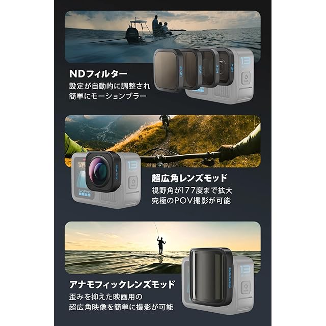 【認定SDカード+非売品日本語説明書+非売品充電口付サイドドアが付属】【自動検出対応 HBシリーズレンズ】HERO13 BlackはHBシリーズレンズ(別売)に対応。目的の撮影シーンに応じてカメラを即座にセットアップできます。超広角レンズモッドは、アクション満載のシーンや壮大な風景の撮影で本領を発揮する究極のPOVレンズです。マクロレンズモッドを使うと、細部まで鮮明に映し出すクローズアップショットを撮影できます。NDフィルターを使えば映像にモーションブラーを追加し、明るさを調整してプロレベルに仕上げることができます。プロレベルのシネマティックなショットをお望みなら、アナモフィックレンズモッドをお試しください。レンズやフィルターを取り付けると、HERO13 Blackが自動で検出し設定を調整します。